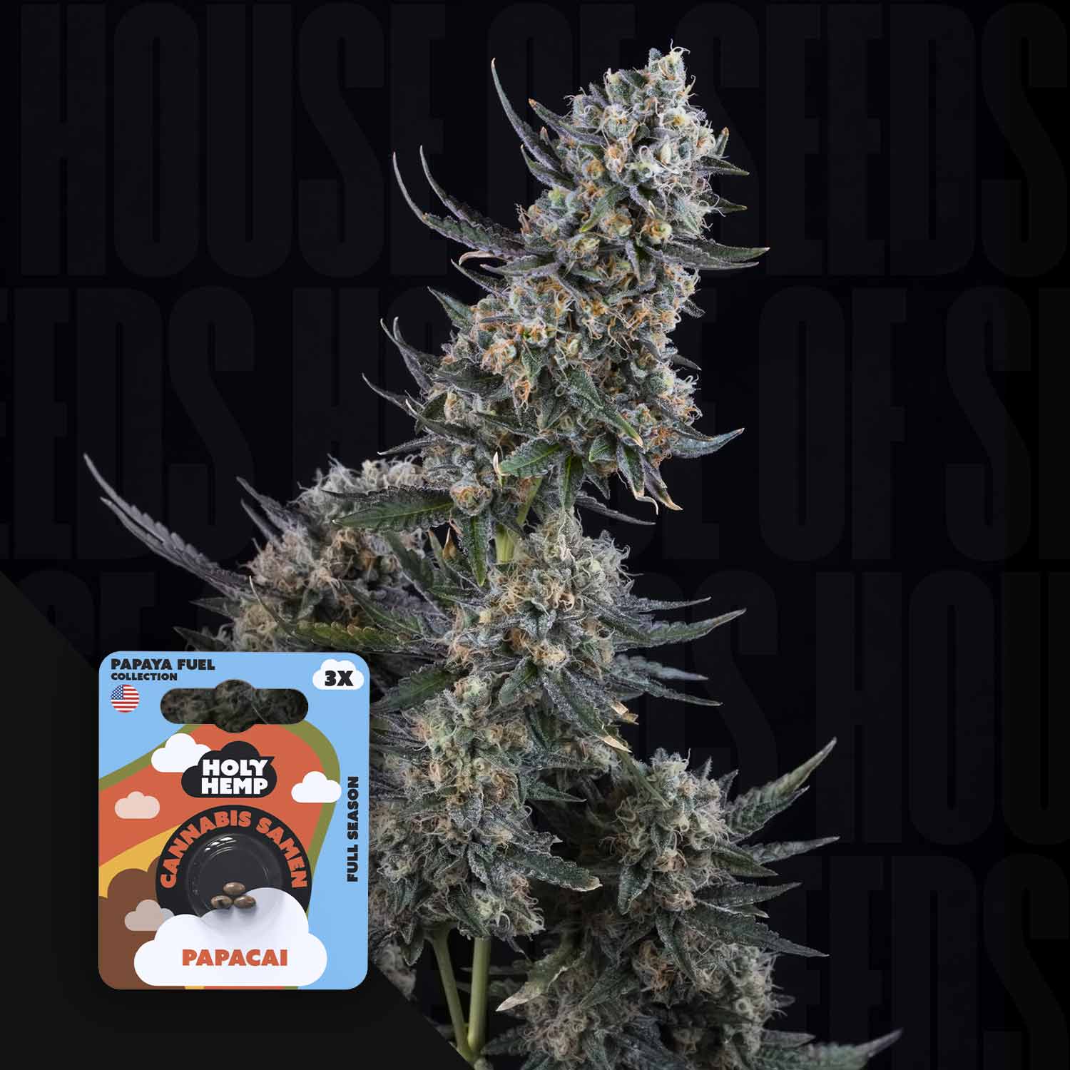 Papacai es un híbrido de predominancia índica, resultado del cruce entre Acai y Papaya Fuel. Esta variedad se caracteriza por su estructura robusta y frondosa, con fuertes ramas laterales y una altura de hasta 1,5 metros. Requiere entre 56 y 65 días de floración y ofrece rendimientos de medios a altos, prosperando tanto en climas templados como mediterráneos. Sus cogollos densos son ricos en resina y están cubiertos por una densa capa de tricomas, lo que realza su atractivo visual e indica su alta potencia. Incluso durante la floración, Papacai desarrolla su aroma característico: una dulce y afrutada mezcla de papaya y notas tropicales, con matices terrosos y ligeramente especiados. Su alto contenido de THC, de entre el 20 y el 25 por ciento, garantiza que esta variedad pueda competir con los mejores híbridos premium en cuanto a potencia.