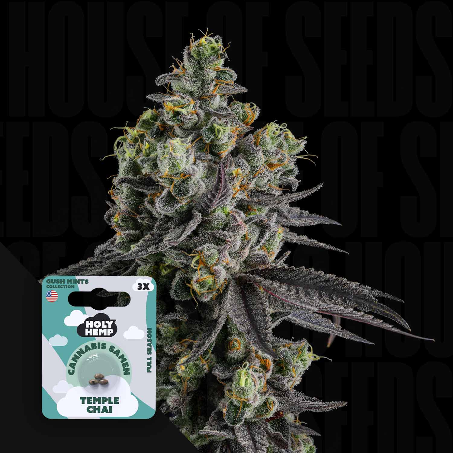 Temple Chai es una variedad híbrida exclusiva de Holy Hemp que combina las mejores cualidades de dos variedades distintivas: Orange Chai y Gush Mints. Esta variedad presenta un porte robusto y frondoso, típico de los híbridos con predominancia Indica. Con un periodo de floración de aproximadamente 56 a 65 días, Temple Chai desarrolla cogollos densos y resinosos, visualmente impactantes gracias a sus tonalidades naranjas y moradas. Las plantas son sensibles a su entorno, lo que las hace especialmente atractivas para cultivadores experimentados. Mientras que Orange Chai prefiere climas cálidos, Gush Mints le aporta adaptabilidad a climas templados; una combinación que convierte a Temple Chai en una variedad versátil. En condiciones ideales, ofrece rendimientos de medios a altos y recompensa a los cultivadores con una abundante producción de resina, liberando un intenso aroma a cítricos dulces y menta especiada incluso durante la floración.