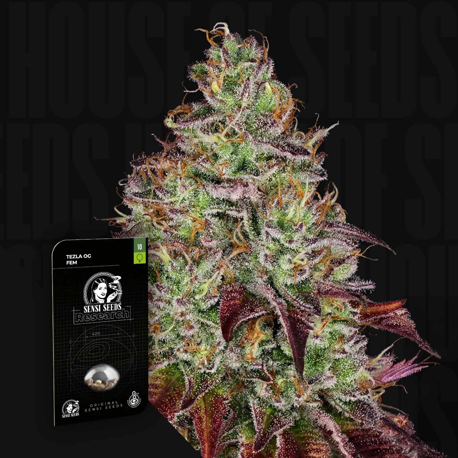 Tezla OG es un híbrido con fuerte influencia Indica, creado por Sensi Seeds, que combina las mejores cualidades de sus parentales: Hash Plant, Shiva Skunk y SFV OG. Esta variedad presume de una estructura robusta, con un crecimiento compacto propio de una Indica, pero desarrollando cogollos cónicos, típicos de una Sativa. Con un tiempo de floración de aproximadamente 56 a 65 días, es una variedad de maduración media-rápida, que ofrece rendimientos de medios a altos. Las plantas son igualmente aptas para el cultivo interior y exterior, y prosperan en climas templados a continentales. Durante su crecimiento, Tezla OG desarrolla ramas fuertes y produce cogollos densos y resinosos con un aroma distintivo. Este aroma combina notas especiadas y terrosas con toques cítricos y la clásica influencia Skunk.
